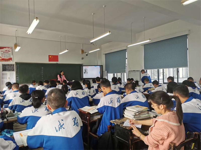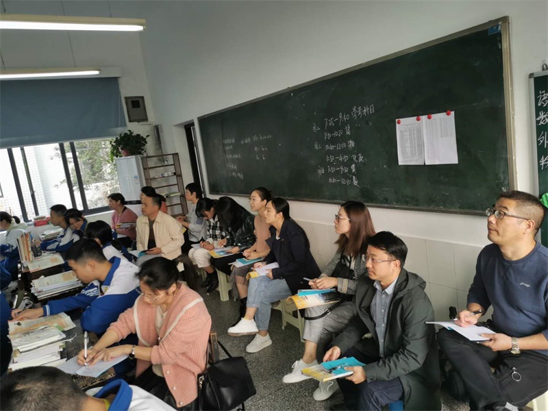 高二语文组全体教师正在专心致志地观摩文星配老师的示范课。