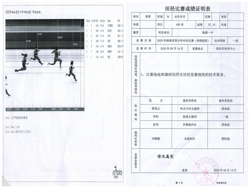 2020年湖南省青少年田径(传统校组)锦标赛我校选手袁梦比赛成绩证明材料