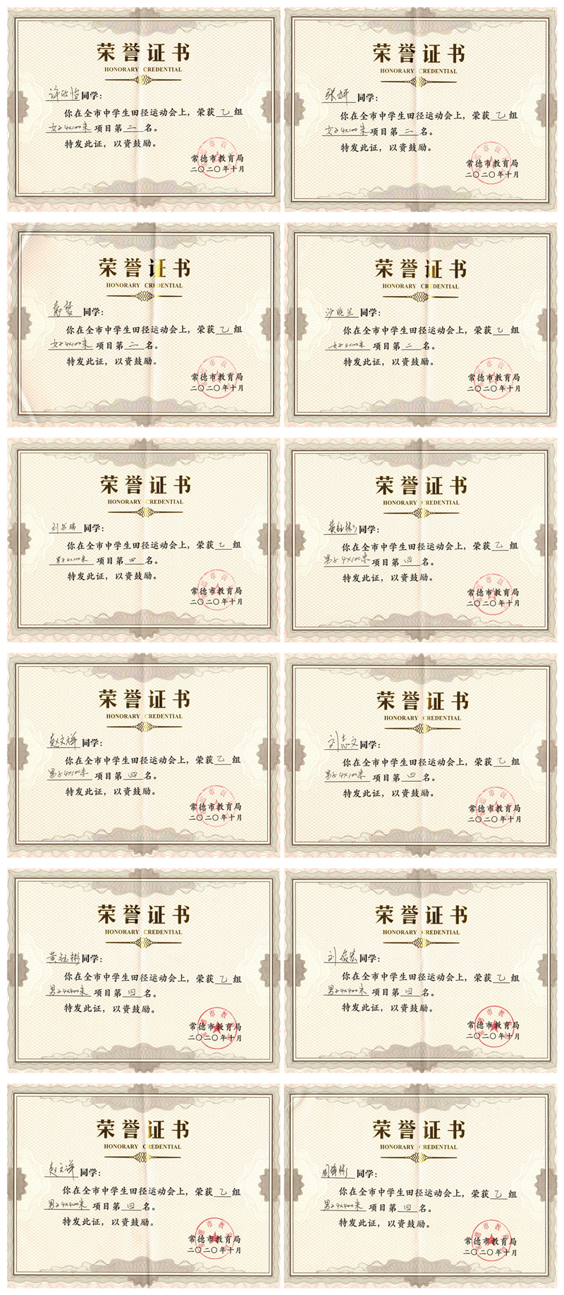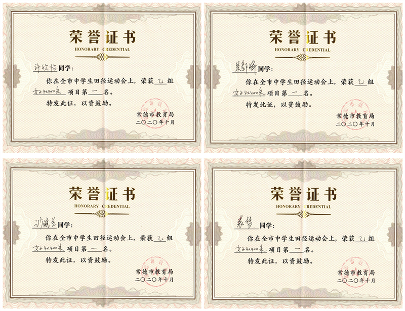 2020年常德市第十三届中学生田径运动会我校选手团体项目第二名、第四名获奖证书集锦