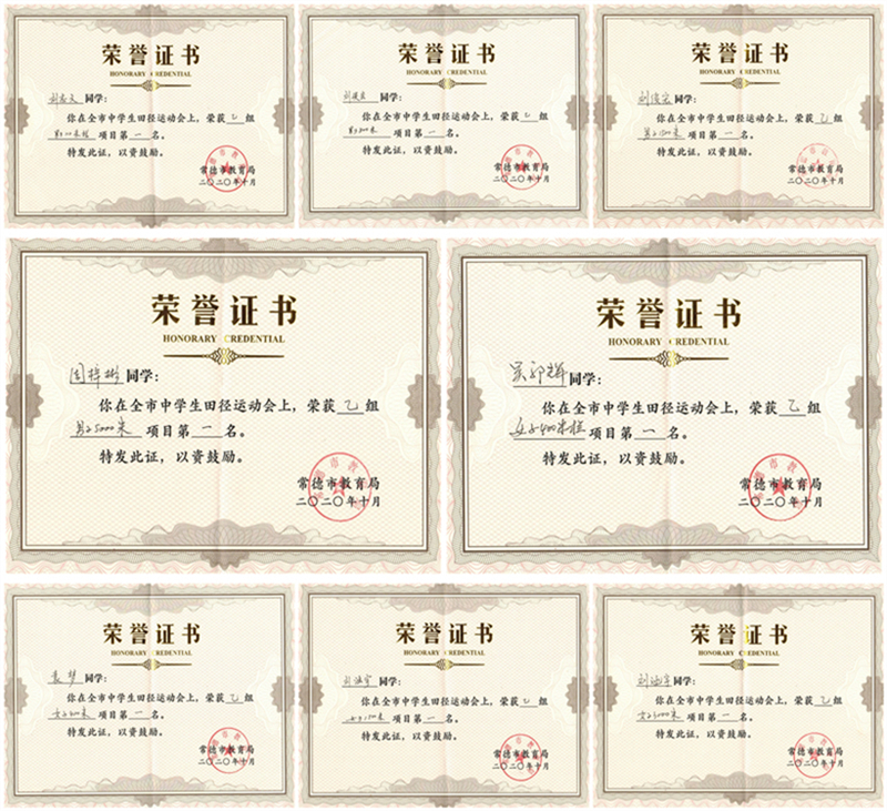 2020年常德市第十三届中学生田径运动会我校选手团体项目第一名获奖证书集锦