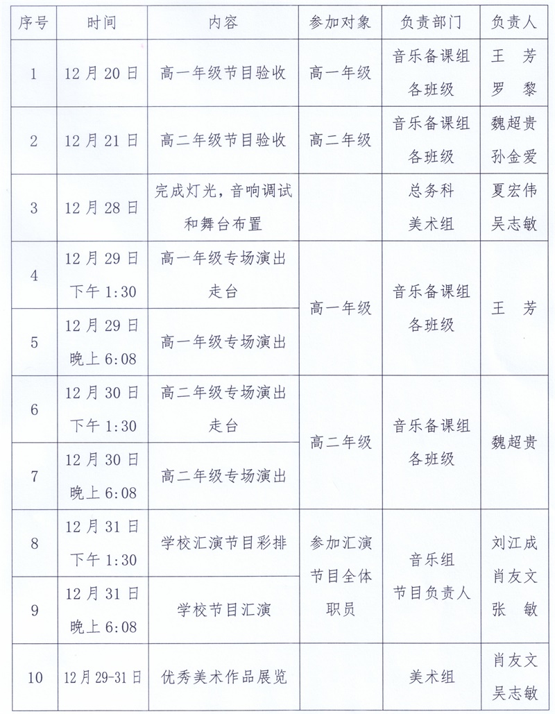 11月6日—11月30日为宣传发动阶段,12月1日—28日作品创作、节目排练与验收阶段,12月29日—12月31日为节目演出和作品展览阶段。具体日程安排见附表。