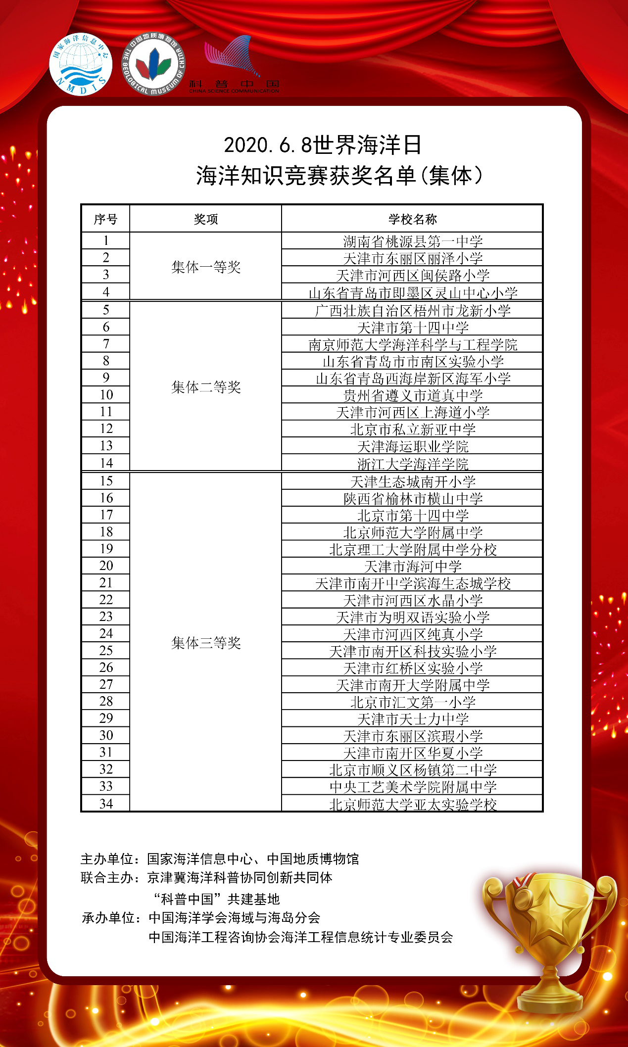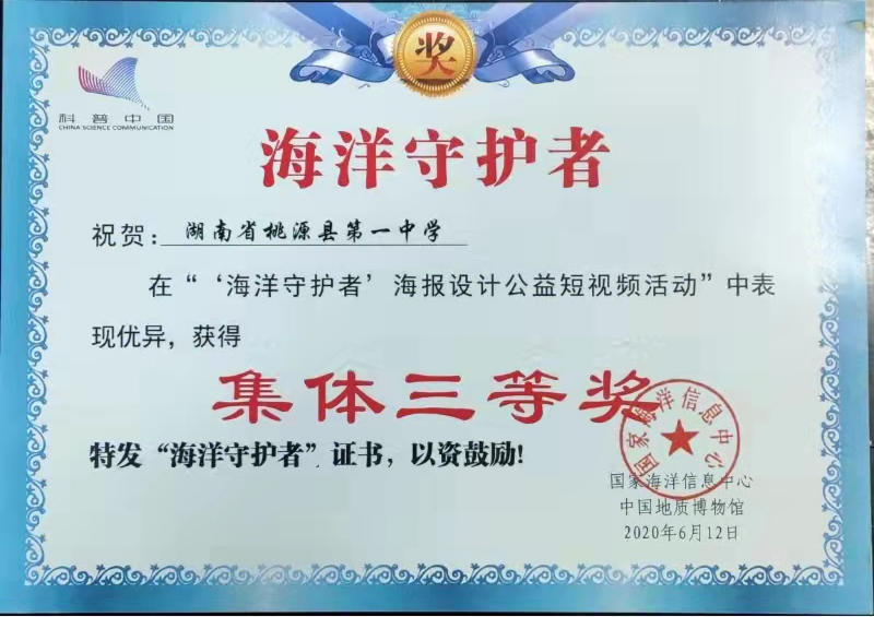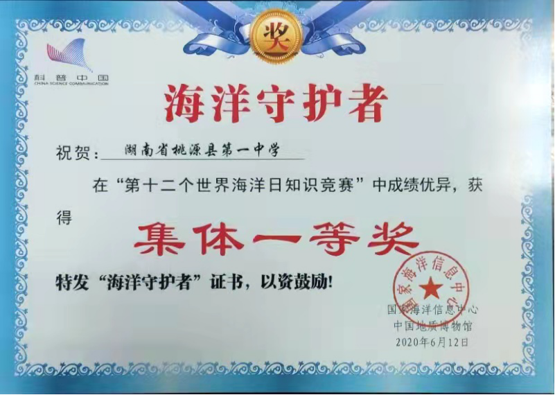 2020年6月8日是第十二个世界海洋日,国家海洋信息中心和中国地质博物馆大力普及宣传海洋科学知识,提升公众海洋科学素养,开展线上线下相结合的海洋知识竞赛活动。桃源县第一中学地理学科中心在学科中心主任刘美桃老师的带领下,高一高二年级地理老师全员参与,组织师生1000多人次参加了此次竞赛,其中高二年级1801班邓可丞同学不负众望获得总决赛一等奖,桃源县第一中学获集体一等奖,刘美桃、叶美春、龚家富、张晓晴、杨玲、杨婉婷、袁金梅、曾祥银、许光柔、向莹、周信华等11位老师获得优秀指导老师称号。