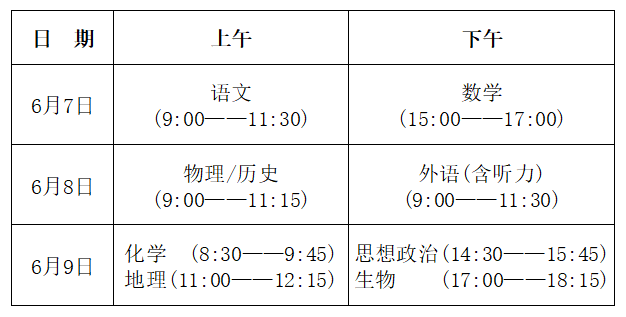 (三)考试时间。语文考试时长为150分钟,数学和外语(含听力)考试时长为120分钟。各选考科目考试时长均为75分钟,具体时间安排如下: