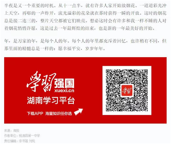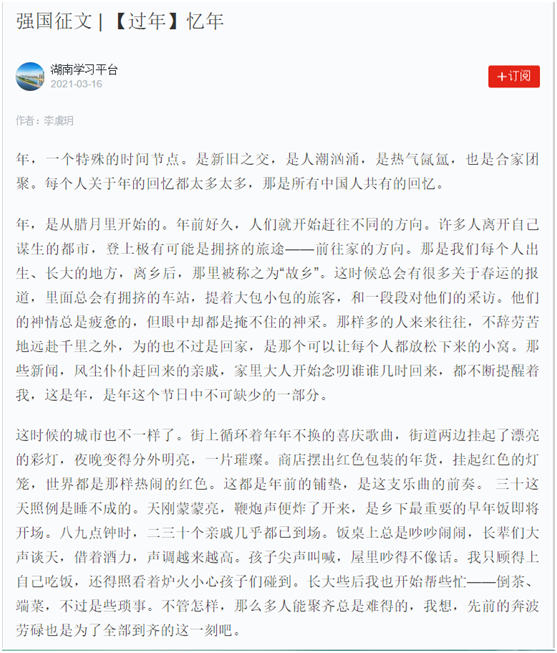 为深入贯彻落实习近平总书记关于传承中华传统文化、坚定文化自信等重要论述,突出乡愁亲情、家风家教等重要文化元素,进一步筑牢家国情怀,为“十四五”良好开局凝聚精神力量,高一年级举办了“过年:中国人的集体记忆”主题征文,共评出一等奖24名、二等奖23名、三等奖33名,并将优秀作品向“学习强国”平台推送。其中2018班李虞玥同学的作品《忆年》由“学习强国”于3月16日刊登发表。