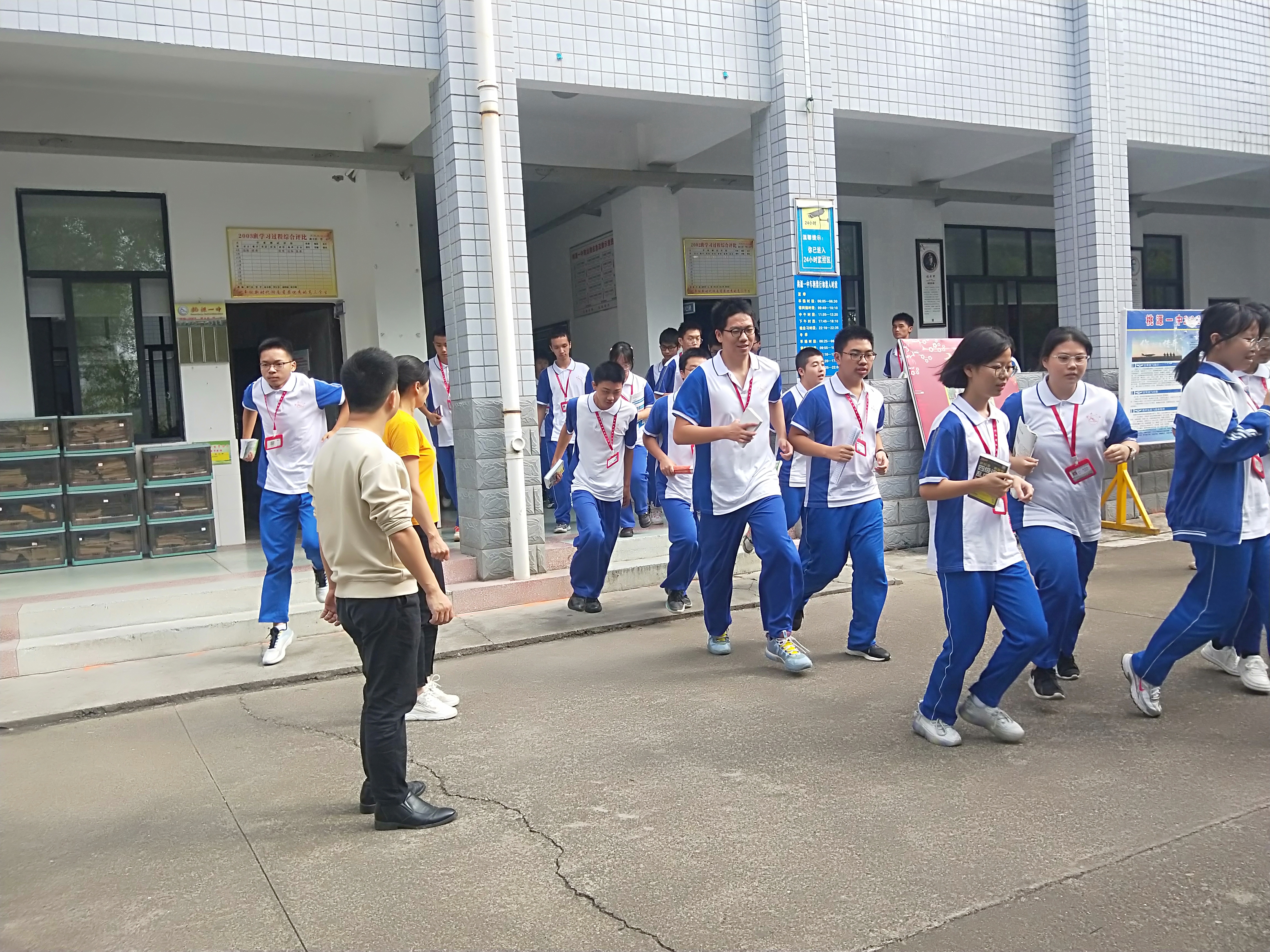 演练分两个阶段进行,第一阶段是进行应急疏散演练。当日上午9:45,高一、高二、高三年级学生在各自的教学楼进行应急疏散演练。随着“警报”信号的发出,三个年级的学生们在班主任的指挥下迅速抱头,有序从前后门跑出教室。班主任以及疏散组老师各司其职、各尽其责,引导学生按指定疏散路线迅速安全撤离到指定地点,并以班级为单位,迅速整队,清点、汇报人数。最终高一年级到达指定位置用时3′9″,高二年级用时2′46″,高三年级用时2′47″。在整个疏散过程中,学生做到了动作迅速不慌乱,无冲、挤、推等行为,达到了较好的预期效果。