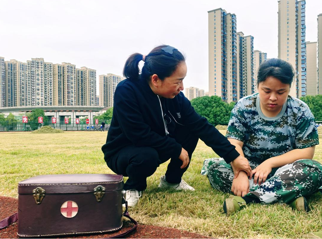 军训见证了同学们训练时努力的汗水,也留下了另外一些忙碌的身影——坚守在同学身边的领导和老师。为保证新军训有序并且顺利地进行,学校为学生们做足医护保障。