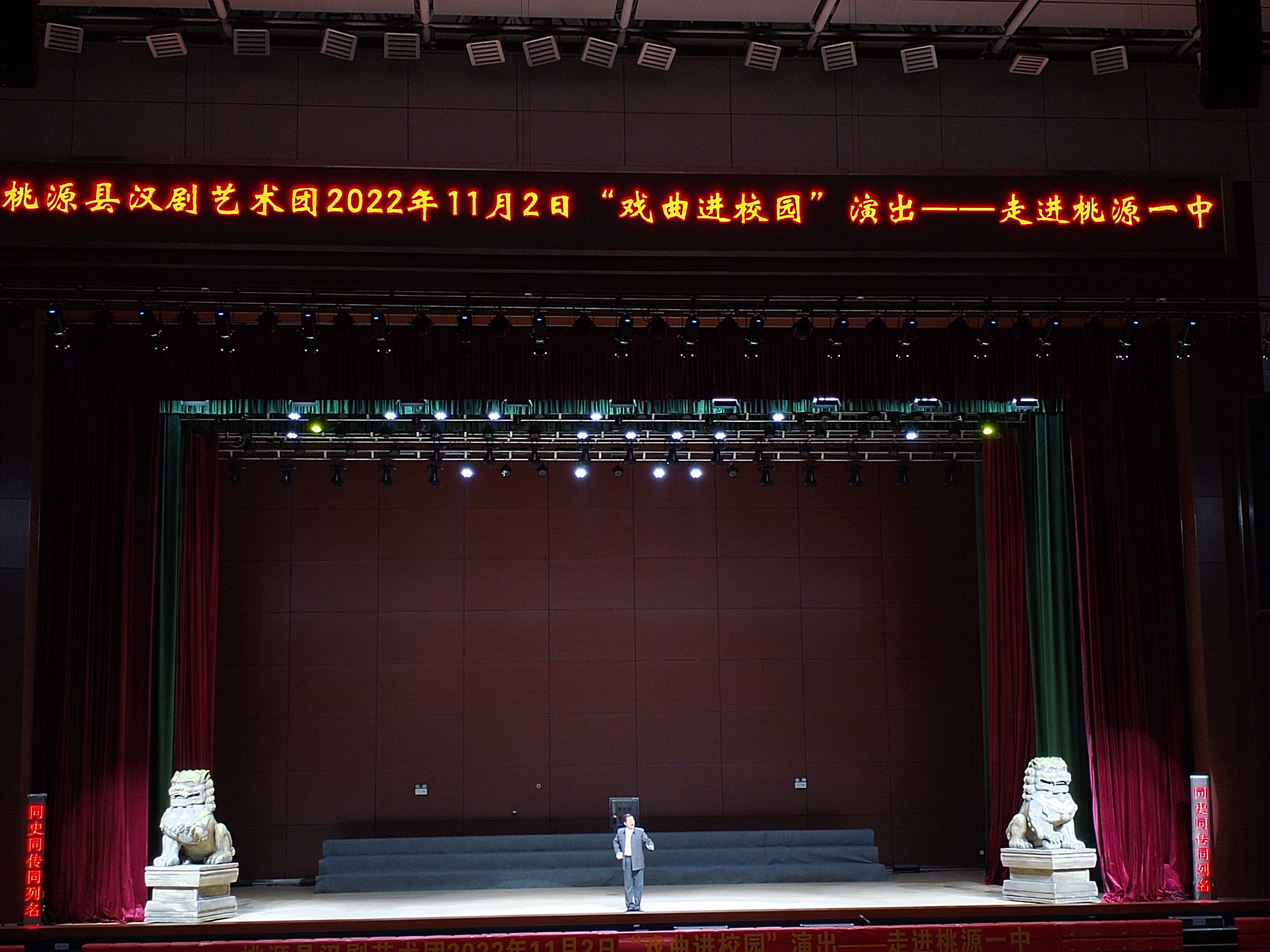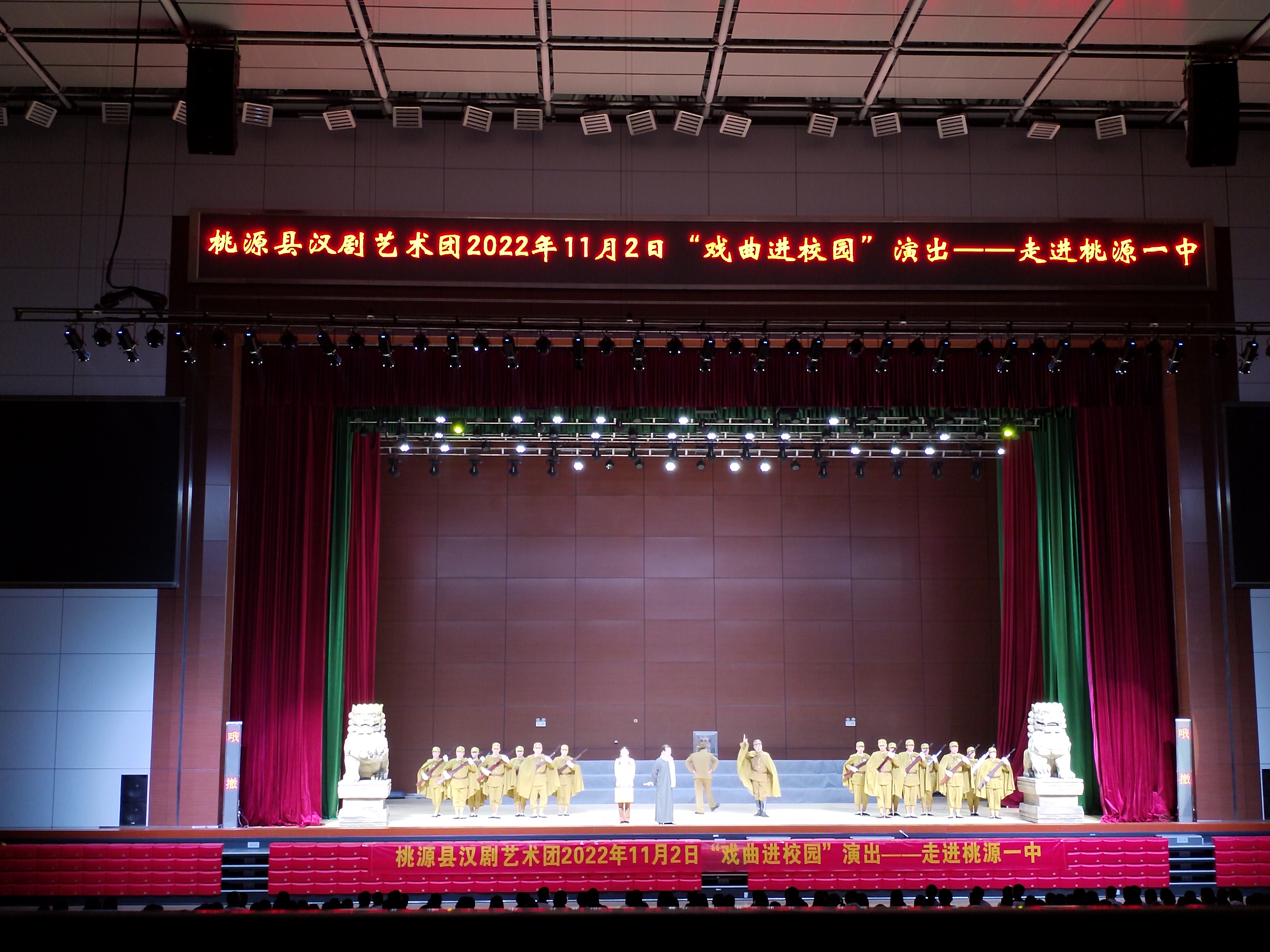 11月2日,桃源县汉剧艺术团走进桃源县第一中学,为高一高二全体学生带来了新创大型舞台剧目——汉剧《翦伯赞》。在学校体育馆的舞台上,演员们为师生讲述了一段有关抗日民族统一战线的动人故事。