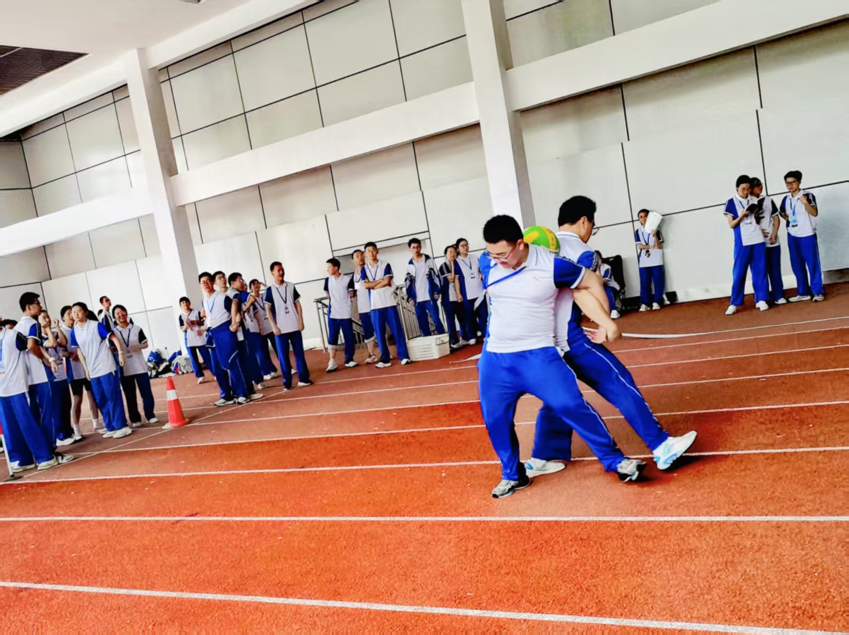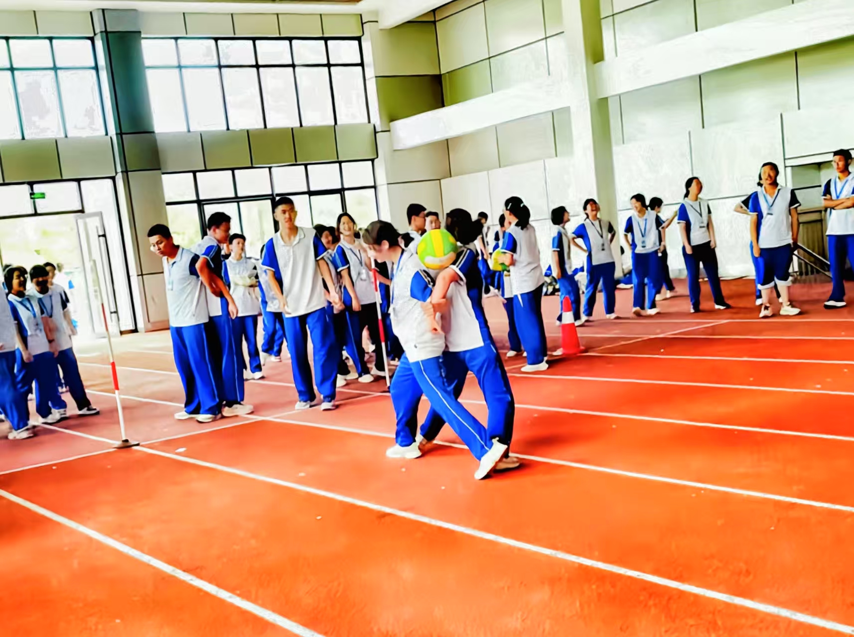 为深入贯彻“五育并举”素质教育理念,响应“体育承载国家强盛、民族振兴梦想”号召,丰富课堂氛围,增强学生身体素质,提升班级荣誉感,5月15日至19日,我校高一年级利用体育课时间举行双手背面夹球迎面接力赛。
